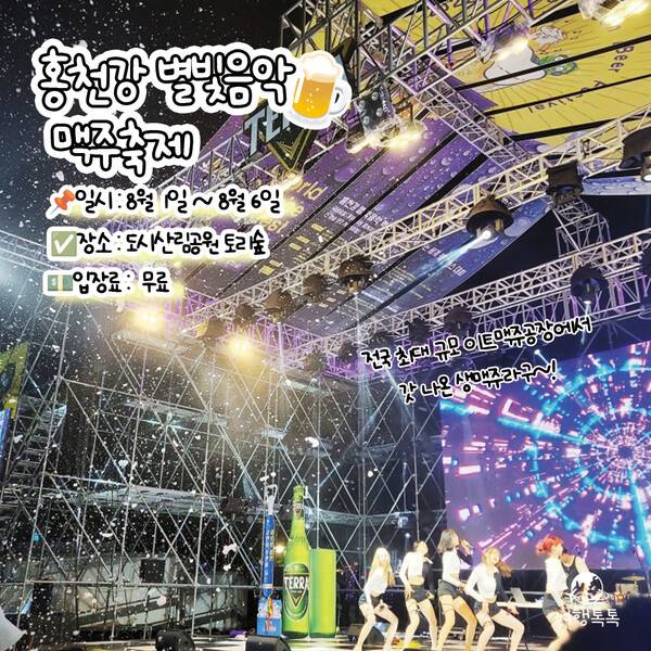 홍천강 별빛음악 맥주축제는 전국 최대 규모라는 맥주공장 하이트에서 갓 생산된 생맥주와 홍천에 고향인 수제맥주 브라이트바흐, 에이앤씨브루잉, 용오름 등 마을에서 만든 시골수제맥주, 세계맥주인 블랑과 파올라너를 맛볼 수 있는 강원도축제 입니다.