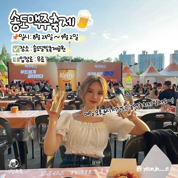 작년에 이어 올해도 열리는 송도맥주축제! 8월 25일부터 9월 2일까지 일주일 넘게 열리며 입장료없이 누구나와서 즐길 수 있다고 합니다. 송도맥주축제는 주차장은 따로 마련되어 있지 않다해 대중교통을 이용하는게 좋을 것같습니다.