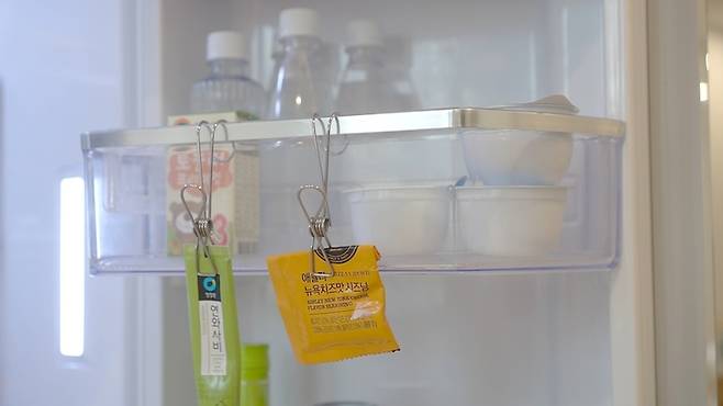 요리하다가 남은 소스를 보관할 때도 이렇게 냉장고 도어에 걸어주면 간편하게 보관 가능해요. :)