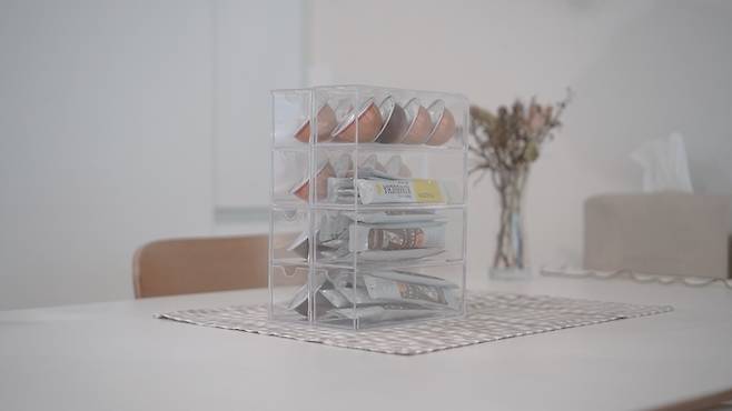 저희 집에서는 커피 캡슐 보관하는 용도로 사용하려고 합니다. 저는 버츄오 기계를 사용하고 있어서 한 칸에 4개씩 들어가는데 일반 캡슐은 더 많이 수납 가능할 것 같아요.
