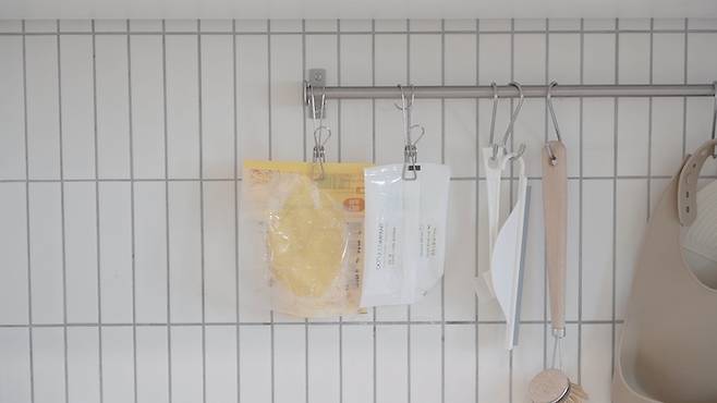 그리고 저는 비닐 재활용품을 이렇게 잘 씻어 건조한 후에 주방 하부장 한편에 모아두는 편인데, 이렇게 집게를 활용해서 주방 간이 쓰레기통으로 쓰면 좋아요.