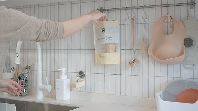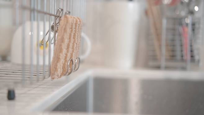 이걸 뒤집어서 걸어주면 스펀지 수세미 보관도 가능합니다. 보관하기 딱 좋죠? :)