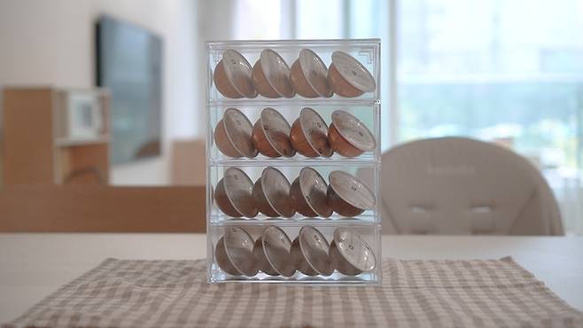 저희 집에서는 커피 캡슐 보관하는 용도로 사용하려고 합니다. 저는 버츄오 기계를 사용하고 있어서 한 칸에 4개씩 들어가는데 일반 캡슐은 더 많이 수납 가능할 것 같아요.