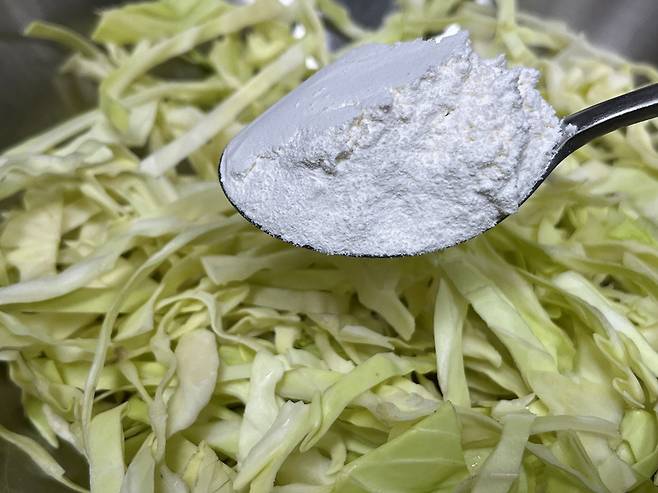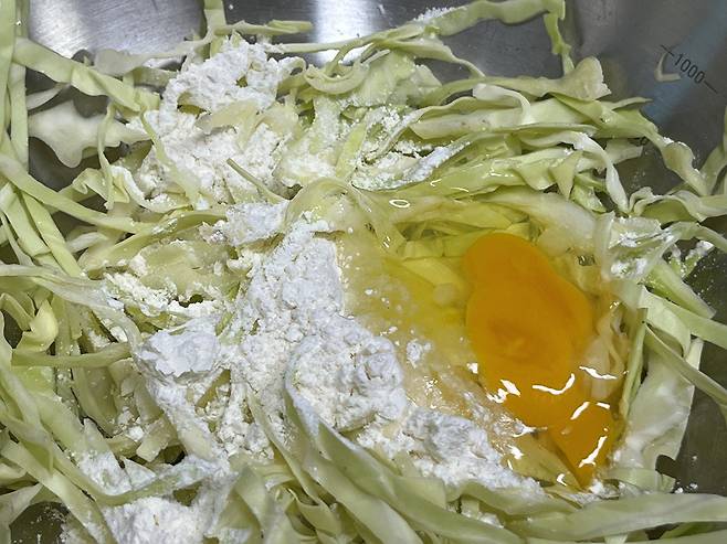 양배추 80g에 부침가루를 수북하게 1스푼 넣으세요. 부침가루는 많이 넣으면 텁텁해지므로 절대 많은 양을 넣지 마세요.