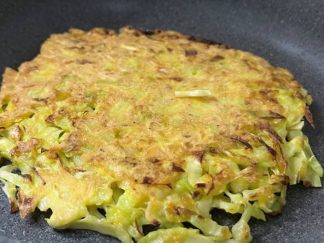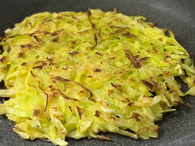 양배추 전 바닥면이 노릇하게 구워졌으면 뒤집어서 반대쪽도 노릇하게 익혀 주세요. 금방 만들 수 있고 방법도 쉬운데, 맛까지 훌륭한 양배추 전 레시피입니다.