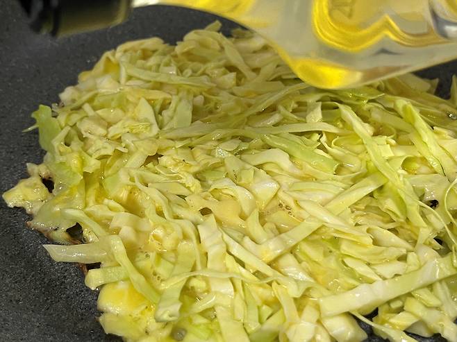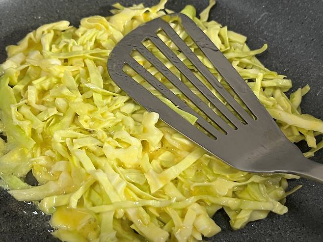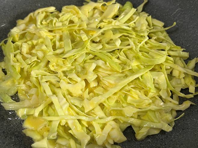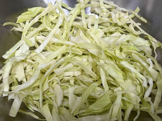 양배추는 채를 썰어 준비합니다. 양배추를 가늘게 채 썰면 빨리 익기 때문에 조리 시간이 훨씬 빨라집니다.