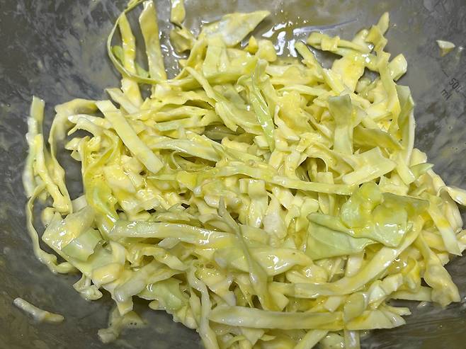 재료를 고루 잘 섞어서 양배추 전 반죽을 만드세요. 전이라고 해서 묽고 뚝뚝 떨어지는 반죽을 생각하실 텐데, 그렇게 안 하고 양배추 겉에만 살짝 코팅한다는 느낌을 만들면 됩니다.