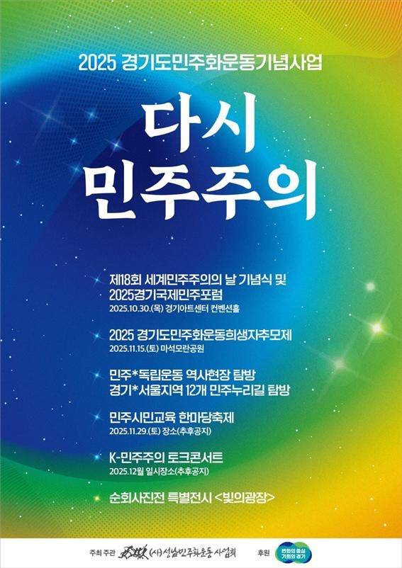 제18회 세계민주주의의 날 기념 ‘2025 경기국제민주포럼’이 오는 10월 30일 오후 2시부터 경기아트센터 컨벤션홀에서 열린다. (사)성남민주화운동사업회가 주최·주관하고, 경기도가 후원하는 이번 포럼은 ‘광장 민주주의 그리고 K-민주주의의 새로운 지평’을 주제로 열린다.