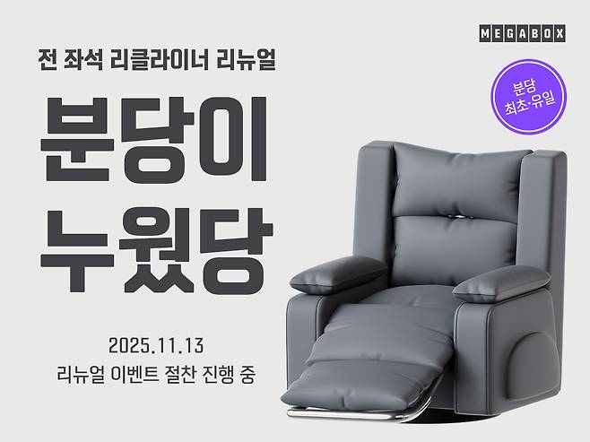 메가박스가 오는 13일 분당점 전 좌석을 리클라이너르 업그레이드해 정식 리뉴얼 오픈한다고 10일 밝혔다.