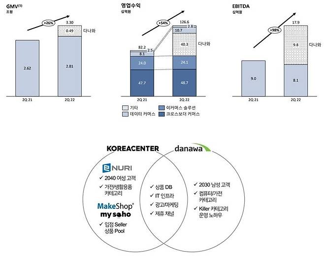 이미 데이터 커머스 부문은 회사의 영업수익 및 이익 기여도가 가장 높은 사업으로, 특히 지난 3월 다나와가 편입되며 급성장했다. 코리아센터의 2분기 실적을 보면 데이터 커머스의 총 상품 판매량(GMV)는 전년 동기 대비 200% 성장한 7400억원을 기록했다. 월활성이용자수(MAU)도 전년 동기 380만명에서 당기 1880만명으로 394% 늘었다.