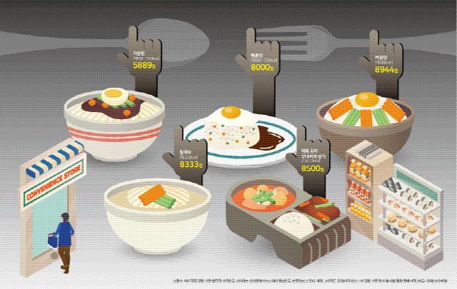 편의점 대표메뉴로는 김밥(300∼400kcal) 2500원·달걀2개입(131kcal) 2000원, 초코바(200kcal) 1000원 등 5000원대 식단, 편의점도시락(770kcal)으로는 4000원대로 적정 열량에 맞는 한끼를 해결할 수 있다.