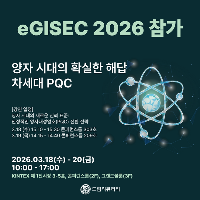 정보보안 전문기업 드림시큐리티(대표 범진규·오석주)는 18일부터 20일까지 사흘간 일산 킨텍스에서 개최되는 '제14회 전자정부 정보보호 솔루션 페어(eGISEC 2026)'에 참가해 양자 전환 시대를 대비한 최신 보안 기술력을 선보인다고 17일 밝혔다.