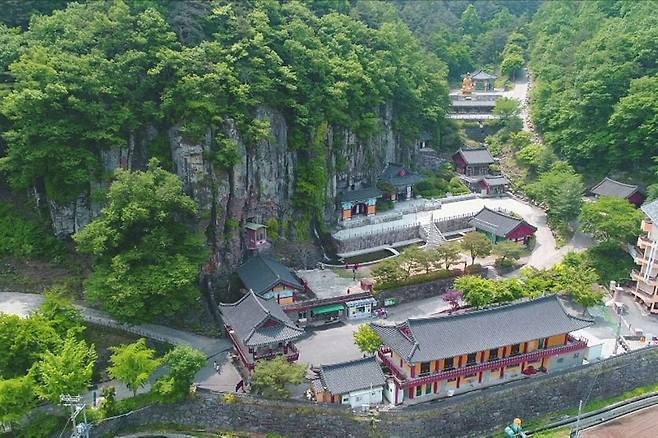 일붕사는 동양 최대의 동굴법당을 자랑하는 사찰로, 경이로운 동굴법당과 기암절벽 사이로 새겨진 불상이 인상적입니다.