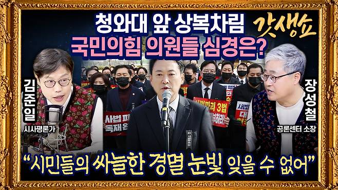 ▶ 장성철 : 근데 거기에 도보 행진에 참여한 의원 얘기를 좀 들어봤더니 가다가 이제 일반 시민들도 맞이할 거 아니에요. 그분들의 그 싸늘한 격멸하는 듯한 눈빛을 잊지를 못하겠다고 하더라고요. 그래서 거리에 나가서 직접 대민 접촉, 국민 접촉을 하는 게 상당히 두렵다. 그 정도까지 싸늘한 민심을 확인한 그런 도보 행진이었다.