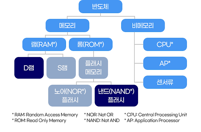메모리 반도체는 다시 램(RAM: Random Access Memory)과 롬(ROM: Read Only Memory)으로 나뉘고, 램에는 D램(Dynamic RAM)과 S램(Static RAM)이 있으며, 롬은 그 종류가 다양하지만 대표적으로 플래시 메모리(Flash Memory)가 있습니다.