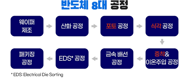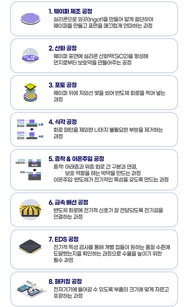 반도체 제조 공정은 아래와 같이 총 8개의 공정으로 이루어져 있습니다.