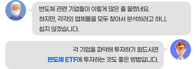 반도체ETF는 삼성전자나 SK하이닉스가 투자를 늘릴 때 높은 수익률을 기대할 수 있는 반도체 장비나 소재주 비중이 높으니, 관심을 가져보시면 좋을 것 같습니다.