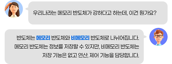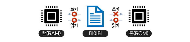 메모리 반도체에는 램과 롬이 있는데, 램은 읽고 쓰기가 가능하고 전원이 꺼지면 데이터가 사라지는 휘발성 메모리입니다. 롬은 읽기 전용 메모리로 전원이 꺼져도 데이터가 사라지지 않는 비휘발성 메모리입니다.