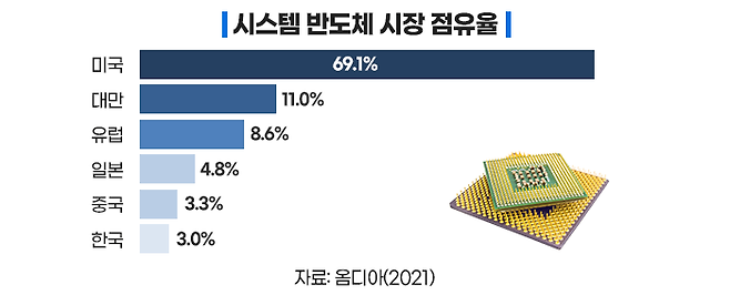 시스템 반도체 시장은 미국의 인텔, 퀄컴 등 글로벌 대기업이 시장의 60% 이상을 차지하고 있으며 한국은 3% 수준에 불과합니다.