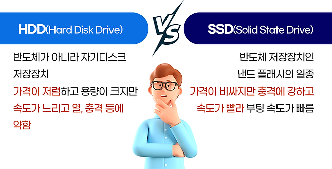 충격에 강하고 컴퓨터 부팅 속도를 빠르게 하는 SSD는 속도가 느리고 충격에 약한 하드 디스크 드라이브(HDD)를 대체하고 있습니다.