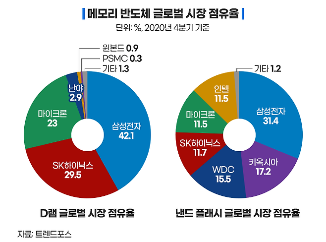 메모리 반도체는 우리나라 반도체 산업을 이끌어가는 분야로 삼성전자와 SK하이닉스가 글로벌 시장에서 높은 점유율을 차지하고 있습니다. 특히 D램과 낸드 플래시는 우리나라가 가장 높은 점유율을 가진 메모리 반도체입니다.