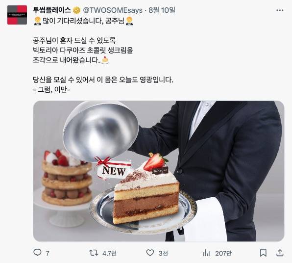 최근 투썸플레이스 신메뉴를 홍보하는 글이 큰 화제가 되었는데요. 이전 "빅토리아 다쿠아즈 초콜릿 생크림을 조각으로 내어왔습니다."라고 올린 게시글에 팔로워들이 "공주는 한 판 다 먹을 수 있다, 조각내지 말고 홀케이크을 가져와라." 등 장난 섞인 반응을 보이자, 이번에는 "공주님 평소 양을 생각하여 한 판 준비했습니다."라고 재치 있게 대응한 거예요. 🍰
