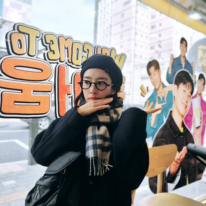 곽선영은 블랙 베레모와 안경을 매치하여 지적인 분위기를 연출했다. 체크 무늬 머플러와 블랙 코트는 겨울철 따뜻함과 세련미를 동시에 살렸다. 가방을 한쪽 어깨에 걸친 모습은 실용적이면서도 자연스러운 일상 패션의 정수를 보여준다.
