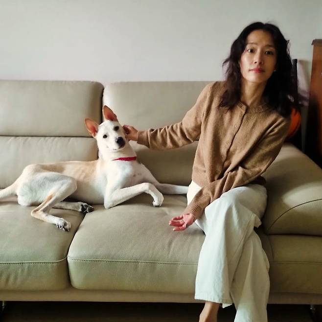 베이지 컬러 카디건과 화이트 팬츠로 차분하고 편안한 홈웨어 룩을 완성했다. 반려견과 함께 소파에 앉아 있는 모습은 그녀의 따뜻한 일상을 엿볼 수 있게 한다. 전체적으로 톤온톤 스타일링이 돋보이며, 심플하면서도 감각적인 분위기를 자아낸다.
