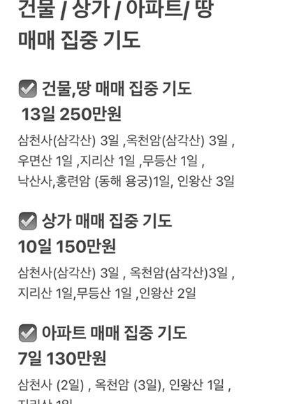 [땅집고] 한 30대 무속인이 부동산 매매 집중 기도 유형별로 제시한 금액. /인스타그램