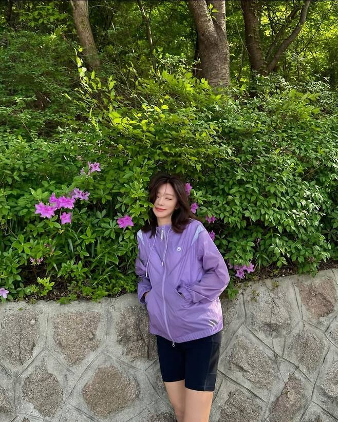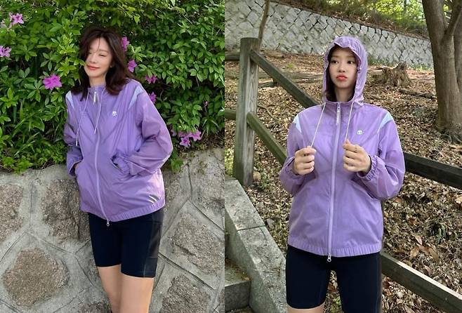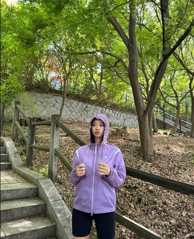 이주빈은 보라색 바람막이 집업을 착용해 우아하면서도 활기찬 분위기를 자아냈습니다.