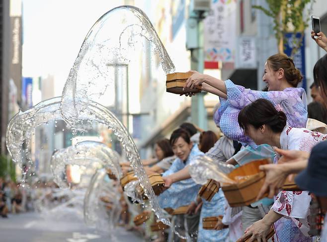 일본의 여름은 한국보다 훨씬 고온다습하다. 그래서 무더위를 이기기 위한 다양한 생활의 지혜가 전해 내려온다. 그중 대표적인 것이 ‘우치미즈’다. 한여름 강렬한 햇볕에 달궈진 길이나 마당에 물을 뿌려 열기를 식히는 방법으로, 일종의 수동식 쿨링포그인 셈이다. 물이 증발하면서 주변의 열을 흡수해 가는 원리를 이용해 기온을 낮춘다. 오사카 최대 서머 페스티벌 ‘우메다 유카타 축제’에서는 ‘우메다 우치미즈 대작전’ 행사를 개최해 이를 다같이 즐기도록 장려한다.