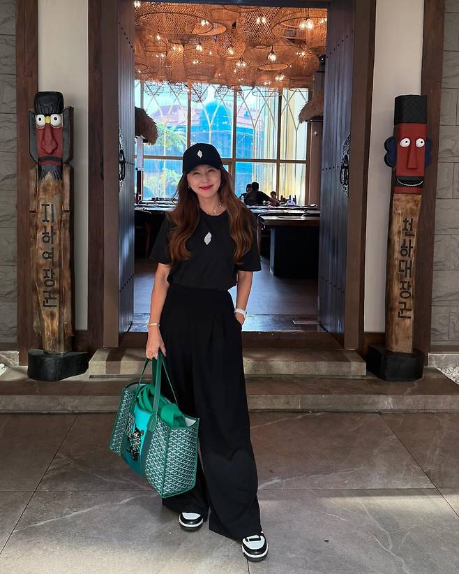 레스토랑 앞에서 포착된 이윤미는 블랙 캡과 티셔츠, 와이드 팬츠로 올블랙 캐주얼 룩을 연출하고 있다. 특히 티셔츠의 화이트 다이아몬드 모티프가 포인트로 작용하며, 민트 그린 컬러의 토트백으로 생동감을 더하고 있다. 플랫폼 슈즈로 키높이 효과를 주면서도 편안한 스타일링을 완성하고 있다. 캐주얼하면서도 트렌디한 이 룩은 일상 속에서도 스타일을 놓치지 않는 배우의 패션 센스를 엿볼 수 있게 한다.