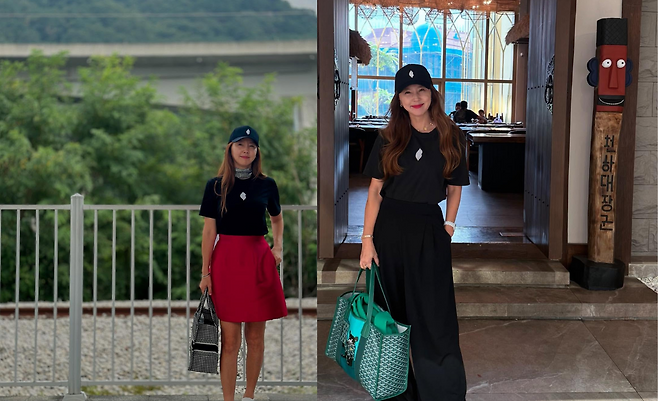 야외에서 포착된 이윤미는 블랙 캡과 블랙 탑을 레드 스커트와 매치해 과감한 컬러 대비를 선보이고 있다. 목에 착용한 초커 스타일의 진주 목걸이는 세련된 포인트 액세서리로 작용하고 있으며, 체크무늬 토트백과 화이트 스니커즈로 캐주얼함을 더하고 있다. 자연을 배경으로 한 이 스타일링은 도시적인 세련미와 편안함을 동시에 추구하는 배우의 실용적인 패션 감각을 보여주고 있다.