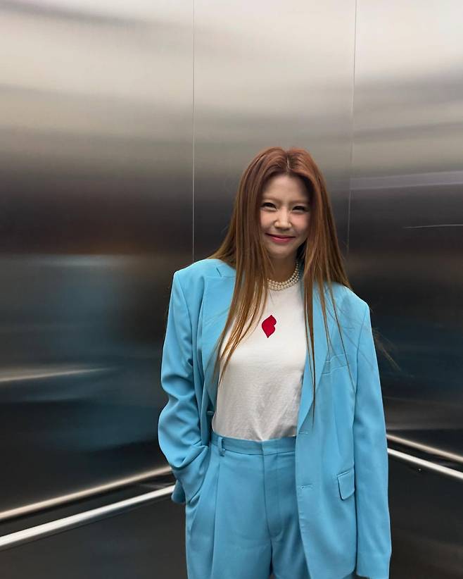 배우 이윤미가 엘리베이터 안에서 포착된 스카이블루 컬러의 수트 세트를 완벽하게 소화하고 있다. 화이트 티셔츠와 함께 매치한 이 룩은 봄날의 산뜻함을 연상시키는 컬러 매치가 돋보인다. 특히 붉은색 포인트가 있는 티셔츠와 진주 목걸이로 포인트를 주어 세련된 오피스 룩을 연출하고 있다. 긴 생머리 스타일링으로 여성스러움을 더하면서도 수트를 통해 당당한 이미지를 표현하고 있어 현대 여성의 다양한 매력을 보여주고 있다.