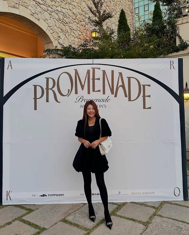 '프로메나드' 행사장에서 포착된 이윤미는 심플한 블랙 원피스와 타이츠로 시크한 올블랙 룩을 선보이고 있다. 화이트 숄더백으로 포인트를 주어 모노톤의 세련미를 강조하고 있다. 포인티드 토 슈즈와 함께 매치해 다리 라인을 더욱 길어 보이게 연출하고 있으며, 자연스러운 웨이브 헤어스타일로 우아함을 더하고 있다. 미니멀하면서도 세련된 이 스타일은 어떤 행사에도 어울리는 완벽한 데일리 룩을 보여주고 있다.