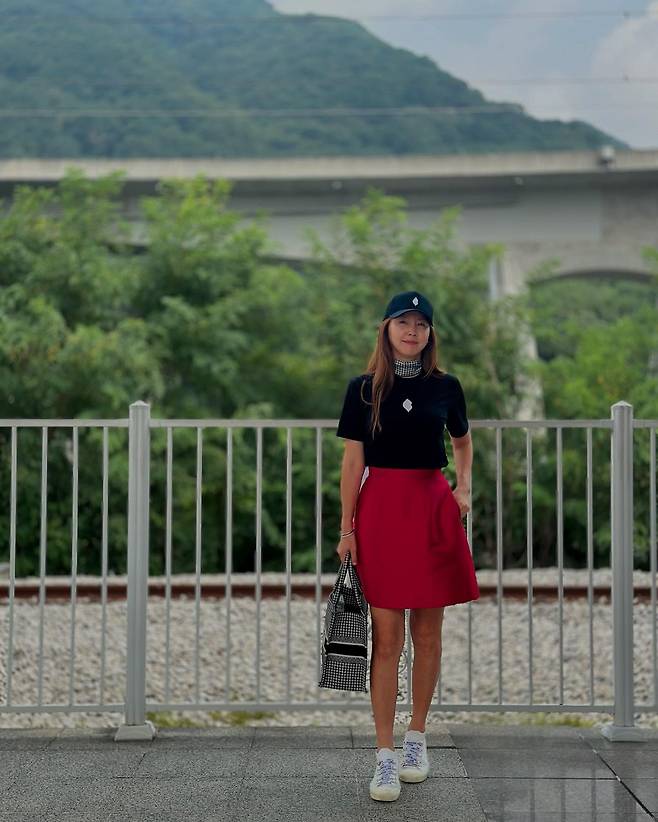 야외에서 포착된 이윤미는 블랙 캡과 블랙 탑을 레드 스커트와 매치해 과감한 컬러 대비를 선보이고 있다. 목에 착용한 초커 스타일의 진주 목걸이는 세련된 포인트 액세서리로 작용하고 있으며, 체크무늬 토트백과 화이트 스니커즈로 캐주얼함을 더하고 있다. 자연을 배경으로 한 이 스타일링은 도시적인 세련미와 편안함을 동시에 추구하는 배우의 실용적인 패션 감각을 보여주고 있다.