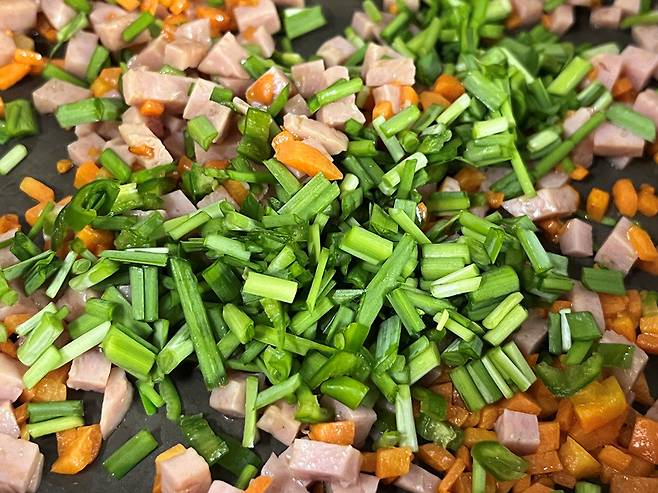 당근, 스팸, 부추, 청양고추 순서로 넣고 기름에 볶습니다. 재료들은 모두 잘게 자른 다음 볶아 주세요. 스팸은 비닐봉지에 넣고 으깨서 사용해도 좋습니다.