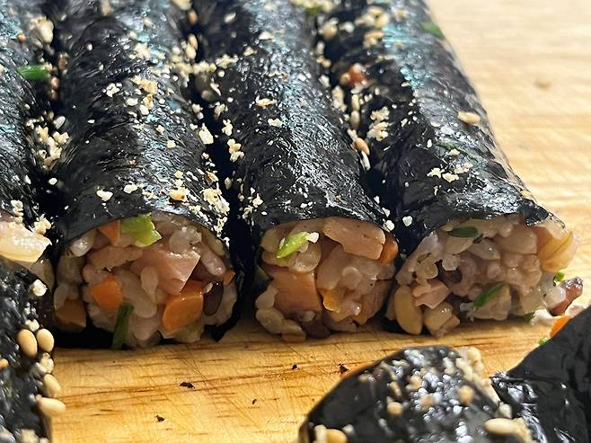 반을 잘라서 먹으면 꼬마김밥처럼 한 입에 편하게 먹을 수 있습니다. 속재료는 따로 넣지 않았지만 밥에 다양한 재료가 이미 들어갔기 때문에 충분히 맛있습니다.