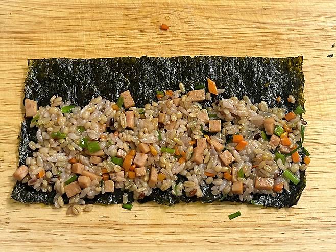 야채와 햄, 밥이 골고루 섞여 간도 적당하게 고소하며 맛있습니다. 일반 김밥보다 2배는 쉽고 빠른 방법으로 김밥을 만들어 보세요!