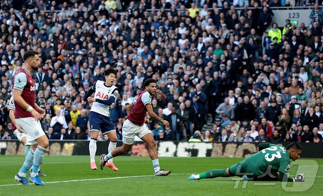 (런던 로이터=뉴스1) 우동명 기자 = 토트넘의 손흥민이 19일(현지시간) 런던 토트넘 홋스퍼 스타디움에서 열린 EPL 웨스트햄 유나이티드와 경기서 시즌 3호 골을 터트리고 있다. 2024.10.20