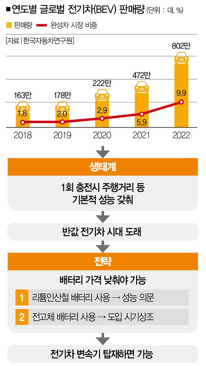 전기차 시장 성장세가 가파르다. 한국자동차연구원에 따르면 지난해 글로벌 전기차(순수전기차 BEV 기준) 판매량은 802만대로 2021년(472만대)보다 115.2% 증가했다. 같은 기간 전체 완성차 판매량 대비 전기차 비중도 5.9%에서 9.9%로 4.0%포인트 상승했다. 완성차 10대 중 1대꼴로 전기차가 팔렸다는 얘기다.