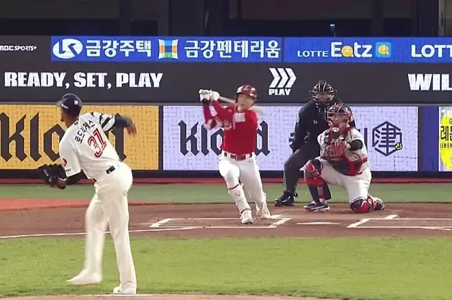 2사 3루에서 최지훈이 친 타구가 중앙 담장까지 뻗었다. 중견수 손호영이 점프 캐치를 시도했지만 놓친 뒤 넘어졌고, 발 빠른 최지훈은 그대로 내달렸다. 그라운드 홈런. SSG 구단 역대 4번째, KBO 역대 103번째 기록이었다. 0-7.