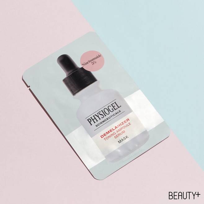 기미, 잡티 케어는 물론, 톤까지 밝혀 피부 속 전구를 켠 듯 투명하고 맑은 피부로 가꿔주는 피지오겔 디멜라나이저 토닝 앰플의 유효 성분을 가득 담은 시트 마스크. 5매 4만원.