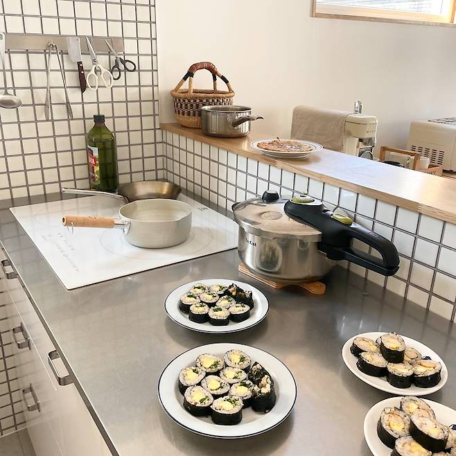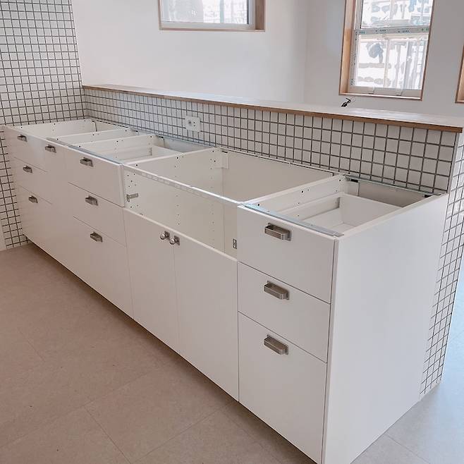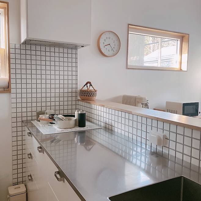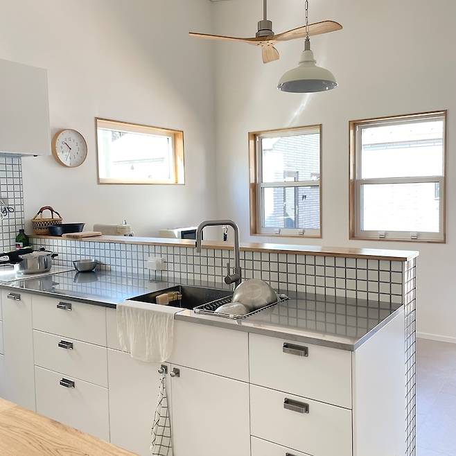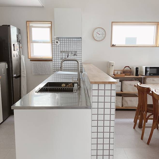 싱크대 상판은 스테인리스 소재에요. 제가 좋아하는 일본 주방 스타일에서 본 스테인리스 상판은 볼수록 꼭 하고 싶다는, 다음에 리모델링을 하게 된다면 꼭 해야지 했는데 이렇게 집을 지으면서 실천했답니다. 사실 가격을 알고 나서는 많이 망설이고, 이케아 싱크대 상판 중에서 고를까 고민도 정말 많이 했어요. 하지만 주변에서 이럴 때 아니면 평생 못한다며 말해주어서 두 눈 질끈 감고 결제했답니다.