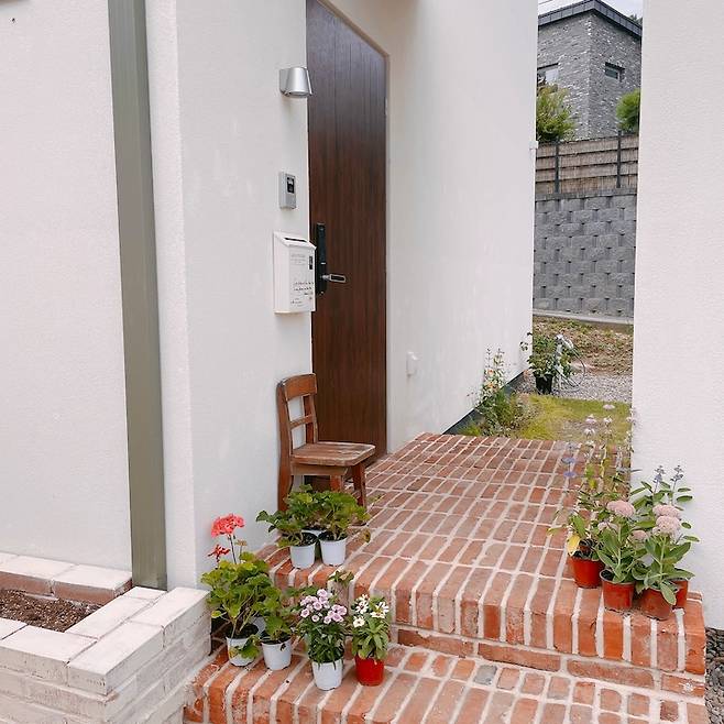 저희 집 현관 포치 모습이에요. 화단 정리도 조금씩 되어서 꽃도 사고 주변도 가꾸고 있어요. 짙은 나무색의 현관이 하고 싶었고, 벽 조명과 우편함도 달고 아래 빈티지 의자를 놓으니 고벽돌 디딤석과 잘 어울리는 것 같아요. 붉은 고벽돌은 볼 때마다 멋스러워요:)