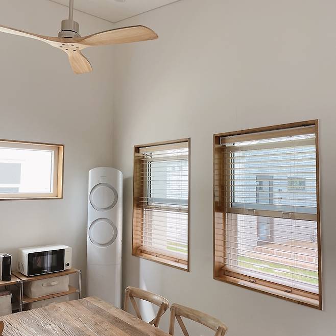 이 쌍둥이 창에 커튼을 달아야 하나 블라인드를 달아야 하나 이사하고도 한참을 고민했는데, 결론은 우드 블라인드였어요. 우드 블라인드 사이로 보이는 풍경이나 각도에 따라 시선 차단을 할 수도 있고 환기에 있어서도 커튼보다는 더 나을 것 같았거든요.