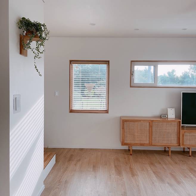 군더더기 없이 심플한 거실이에요. TV 자리는 고정해두고 위쪽으로 기다란 창을 내고, 오른쪽으로는 커다란 창을 내주었어요. 전에는 거실이 집의 중심이고 아이들이 어려서 거실에 책이며 장난감이며 모두 두고 생활했는데, 2층을 따로 거실로 만들면서 여유와 쉼이 있는 곳이길 바랐거든요. 더구나 아이들도 이제 커서 예전만큼 장난감을 가지고 놀지는 않지만 거실장 아래로 보드게임들과 닌텐도는 수납해서 꺼내 놀고 있어요.