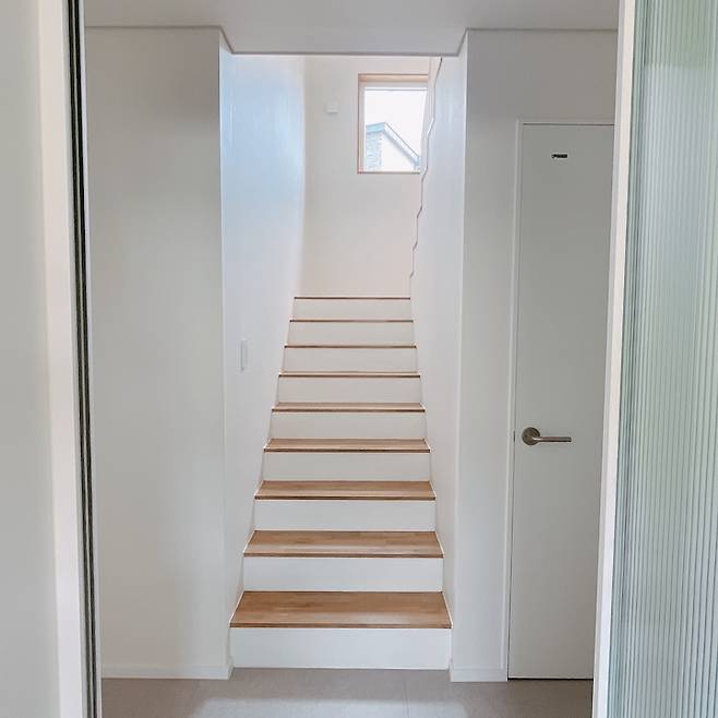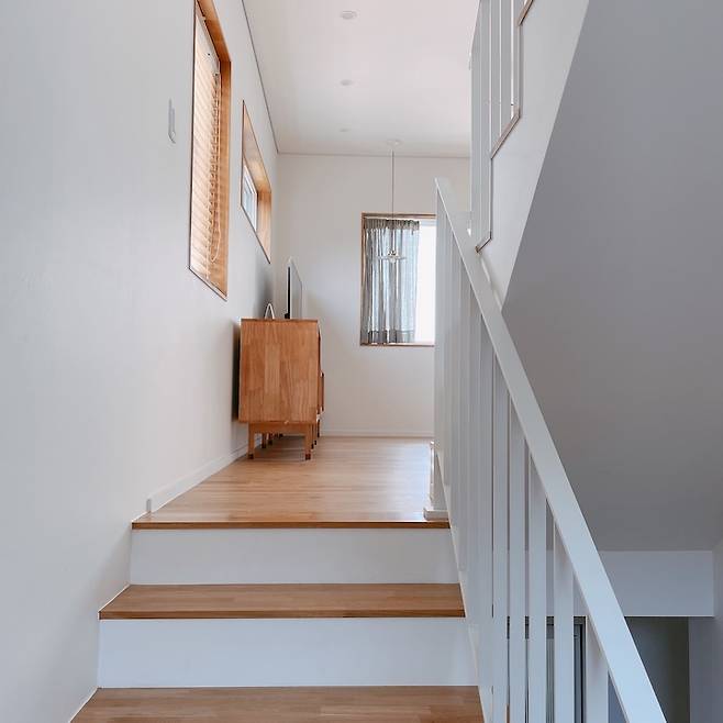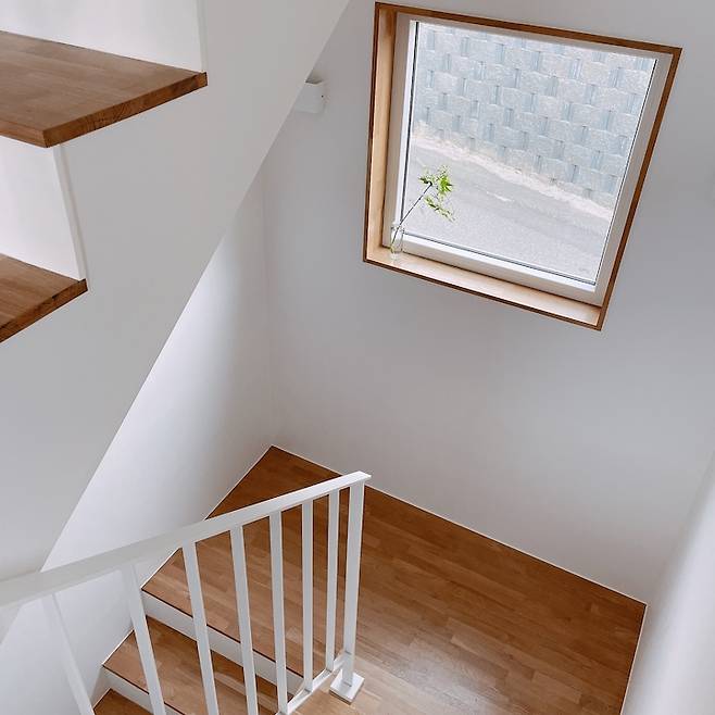 1층에서 2층으로 올라가는 계단에는 고정창을 했는데, 보기에 깔끔하고 좋지만 환기에는 다소 불편한 점이 있어요. 아마 오픈창을 했으면 유리와 프레임 때문에 깔끔함이 덜 하긴 할 거에요.