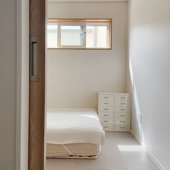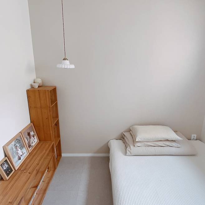 아파트 살 때는 안방이 꽤 넓었기 때문에 붙박이장도 설치하고 이불과 옷 모두 넣고 요솜으로 바닥 생활을 했는데, 옷은 옷방에 이불은 수납함에 각자의 방이 생길 것을 고려해서 부부 방에는 프레임 없이 매트리스와 수납 서랍장만 두었어요.