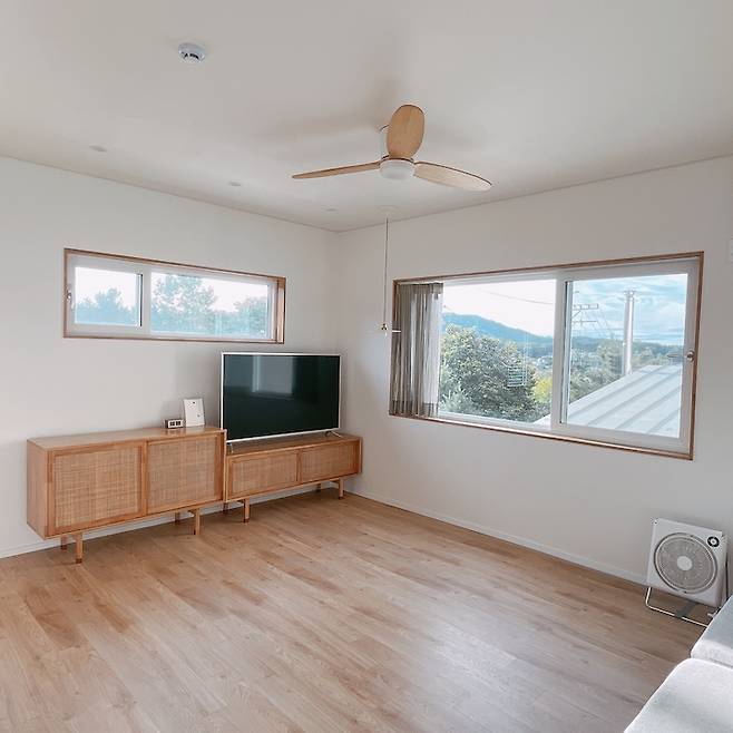 원목 프레임 소파와 TV의 일자 배열이 제일 편한 것 같아요. 소파에 앉아서 멀리 건너편 마을도 보고 하늘을 보다 보면 구름처럼 흘러 쉬고 싶어져요. 소파는 자주 제품이예요.